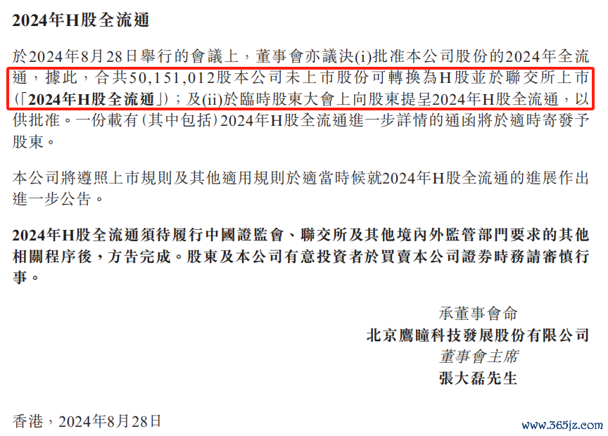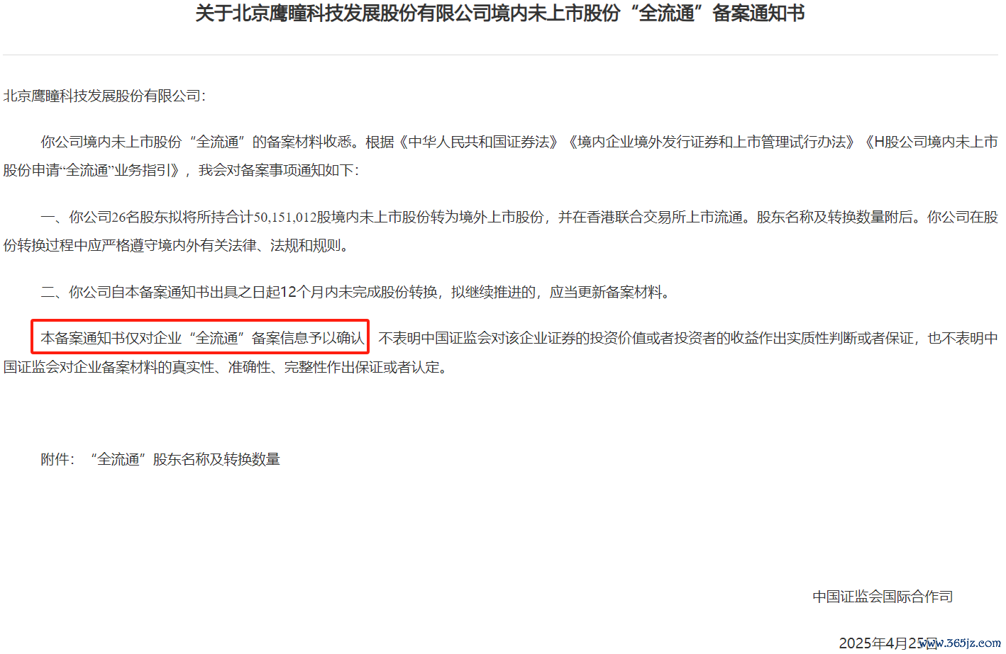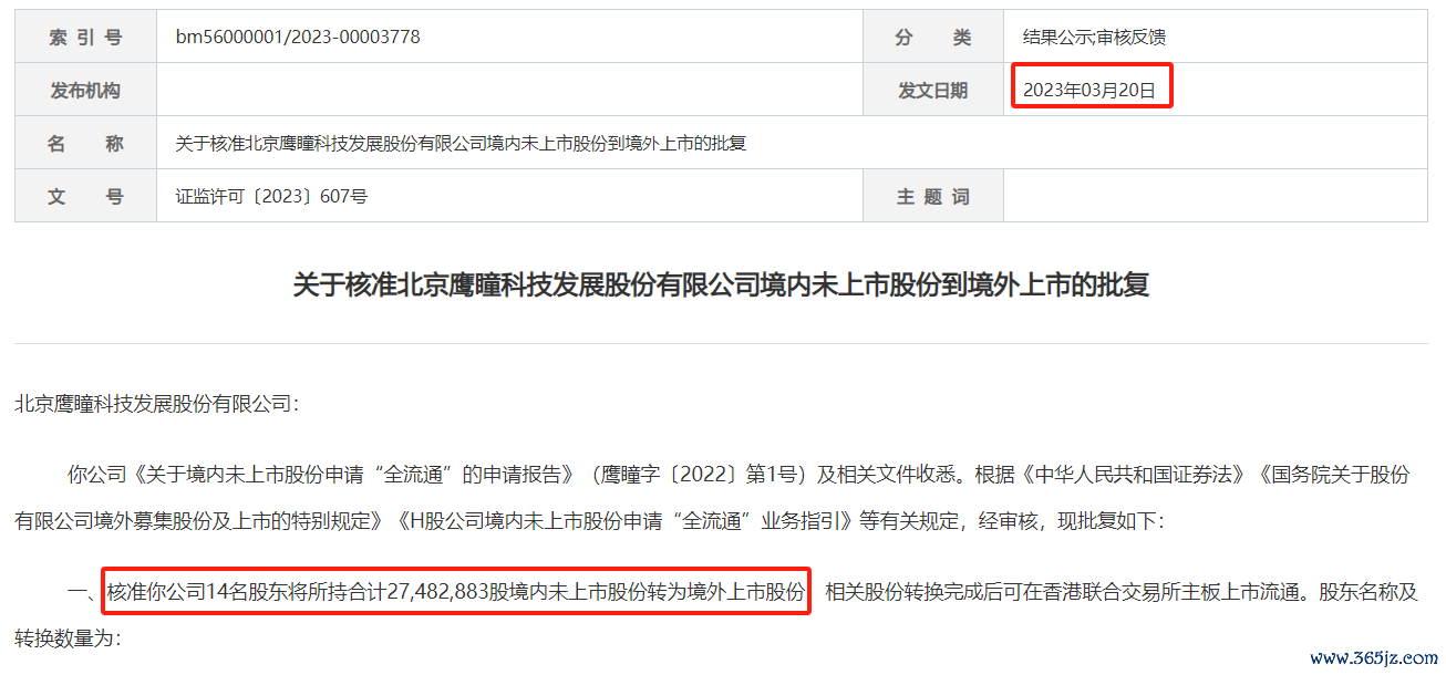 4月25日,中国证监会发布公告,核准鹰瞳科技(02251)境内未上市股份“全流通”备案。