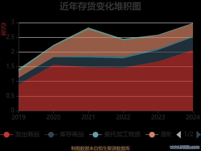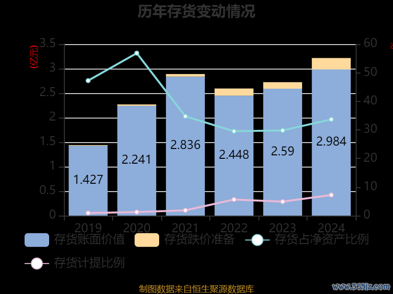 从存货变动来看,截至2024年末,公司存货账面价值为2.98亿元,占净资产的33.65%,较上年末增加3941.37万元。其中,存货跌价准备为2318.81万元,计提比例为7.21%。