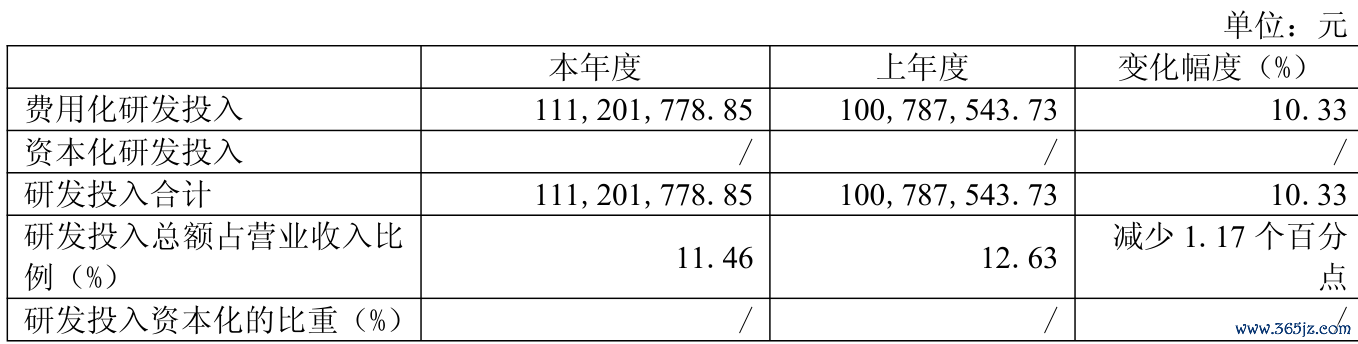 2024年全年,公司研发投入金额为1.11亿元,同比增长10.33%;研发投入占营业收入比例为11.46%,相比上年同期下降1.17个百分点。