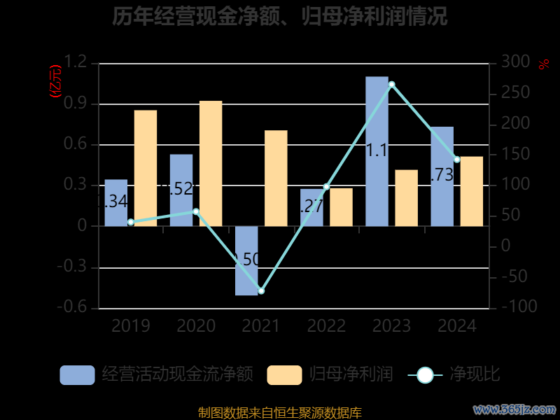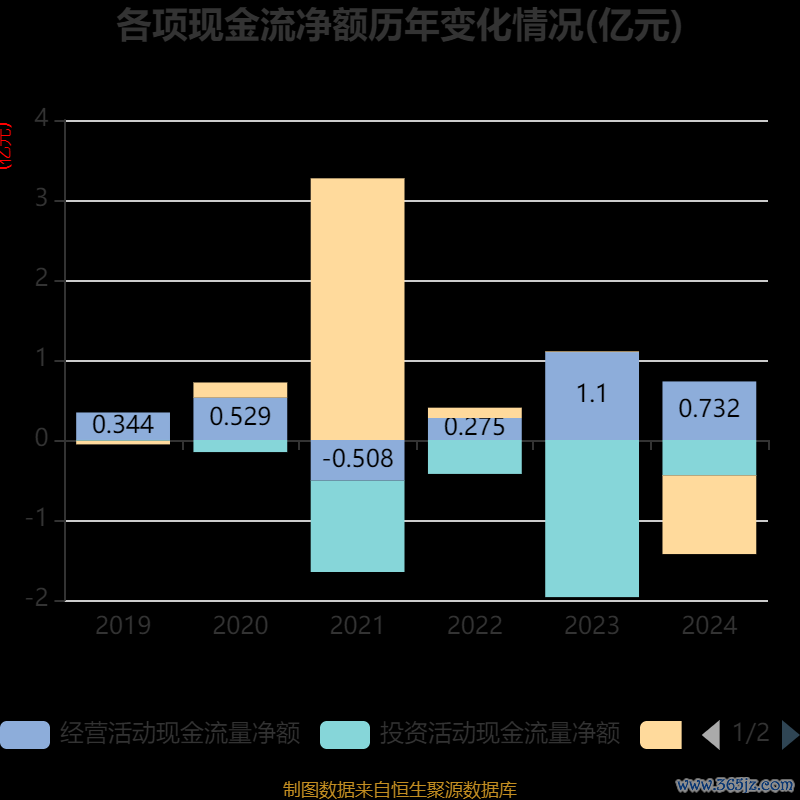 截至2024年,公司经营活动现金流净额为7315.76万元,同比下降33.52%;筹资活动现金流净额-9838.69万元,同比减少9929.19万元;投资活动现金流净额-4419.6万元,上年同期为-1.96亿元。