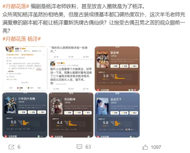 根据知情人士透露,这部剧的编剧是杨洋的铁粉,曾在多年前喊话:自己入圈就是想给杨洋写本子,如果杨洋真的能接这部剧,也算是完成粉丝的一个心愿了,而能和自己喜欢的男明星合作,这绝对是非常好的机会。